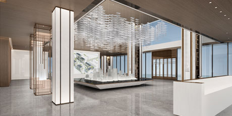 售樓處功能區分散在整個(gè)空間中,形成流暢清晰的循環(huán),平衡了隱性和顯性之間的關(guān)系,在布局中也融入了未知和交互,以留出更多的想象空間。未知刺激下的人與靜態(tài)物品的互動(dòng),可以為空間注入活力。整個(gè)空間營(yíng)造 出簡(jiǎn)約的空間基調。帶有紋理的大理石和木制藝術(shù)裝置被引入,以減輕廣闊空間的空虛感??臻g中的物品與自然和藝術(shù)相連。只有在與人互動(dòng)時(shí),他們才能開(kāi)始扮演角色。淺色調平衡了建筑結構的厚重感,也豐富了空間 的層次感。入口處下沉的燈飾結構打破了空曠感,同時(shí)也豐富了視覺(jué)體驗。水吧、休息區和洽談區緊密相連,共同形成社交的錨點(diǎn)。整個(gè)售樓處以藝術(shù)美學(xué)和極簡(jiǎn)主義為特色,激發(fā)人們與自然的互動(dòng)。